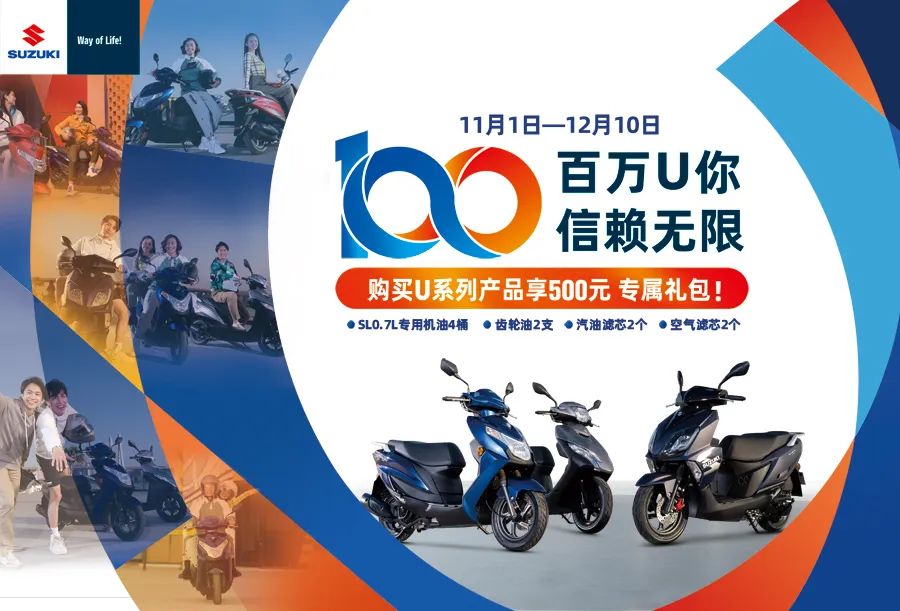 为答谢新老用户对铃木U系列产品的支持与厚爱,11月1日至12月10日,济南轻骑铃木全国范围内开展针对新老用户的“百万U你,信赖无限”专项促销和服务活动,活动期间购买U系列产品均可享受价值500元的专属礼包,参与服务活动除了常规赠品外还有附加赠品和专属车贴。感兴趣的朋友们可咨询当地济南轻骑铃木销售店。