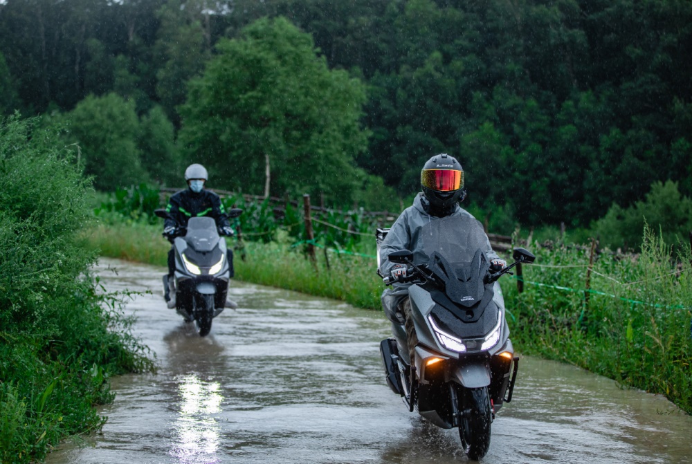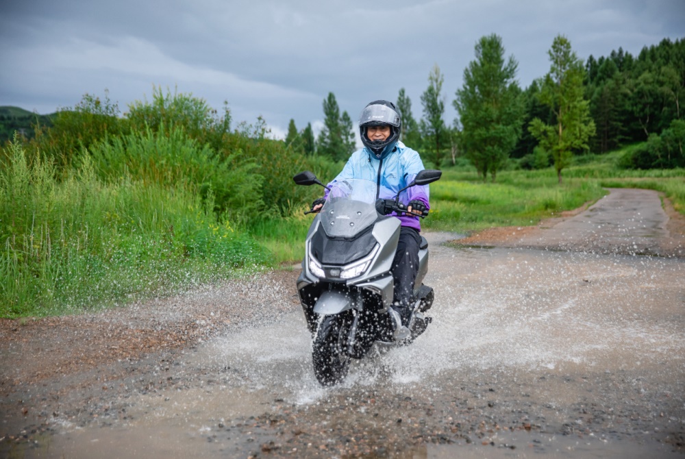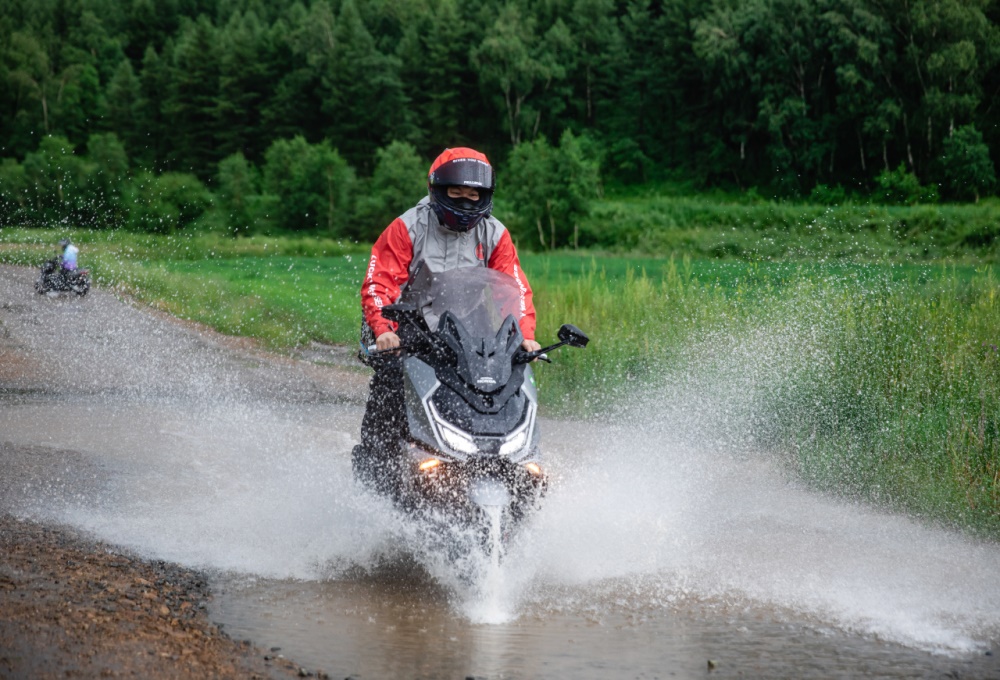 比起下着大雨的铺装路面,更让人难受的是下着大雨的非铺装路面?不,并不是,坑洼不平的路面,碎石和泥土,让人挑战欲望爆棚!NS150GX在这样的路面也拿出来稳定的表现,摇篮式车架配合NSS350同规格悬架,有效过滤了颠簸,半热熔轮胎在碎石较多的地方也没有出现打滑,路况虽不好,但安全感和玩乐性也让骑行变得有趣了起来。