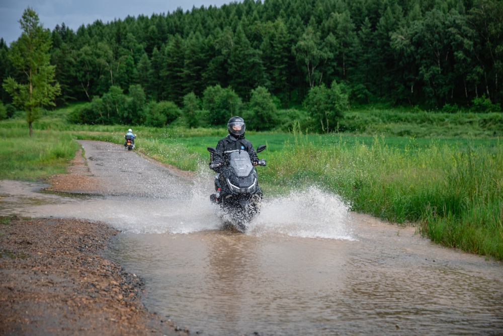 面对水坑,车辆动力输出稳定,只需要稍微控制油门,就能平稳通过,NS150GX良好的通过性,较高的离地间隙让车辆在经过坑洼时不易磕碰底盘,玩水的底气这不就来了吗?